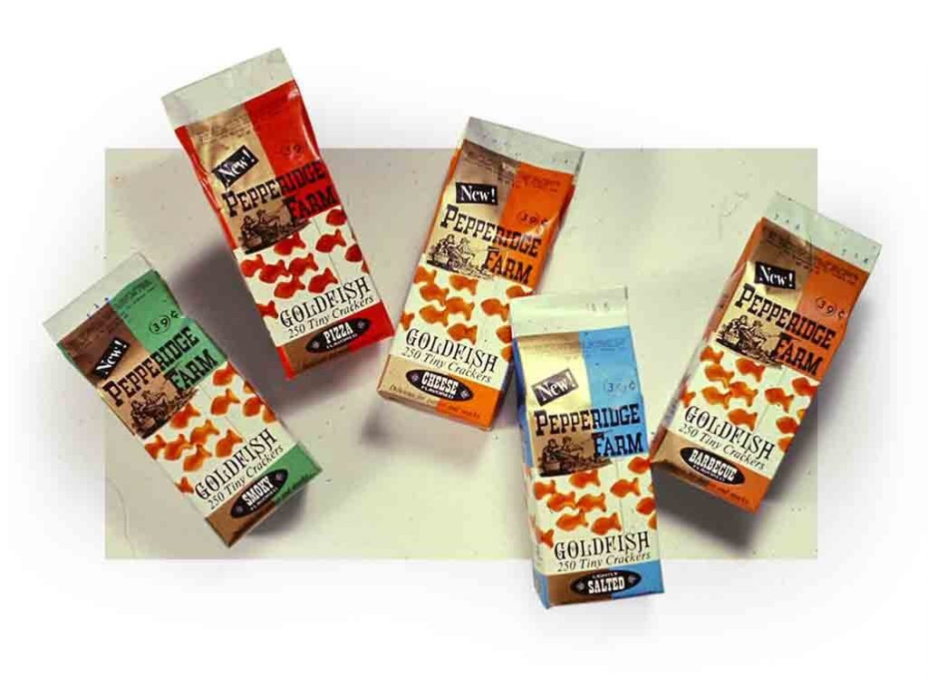 Pepperidge Farm Goldfish debut. The first five flavors are: Lightly Salted (Original), Cheese, Pizza, Barbecue and Smoky. Today, Goldfish are among the world’s most popular snack crackers.
