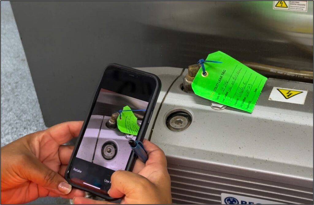 Each plant has stations where employees can find tags and supplies to fill out basic information like type of leak, location, and date. Once tagged, they tear off the bottom portion to hand in to our maintenance team so that they have all the necessary information to make repairs.